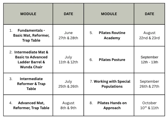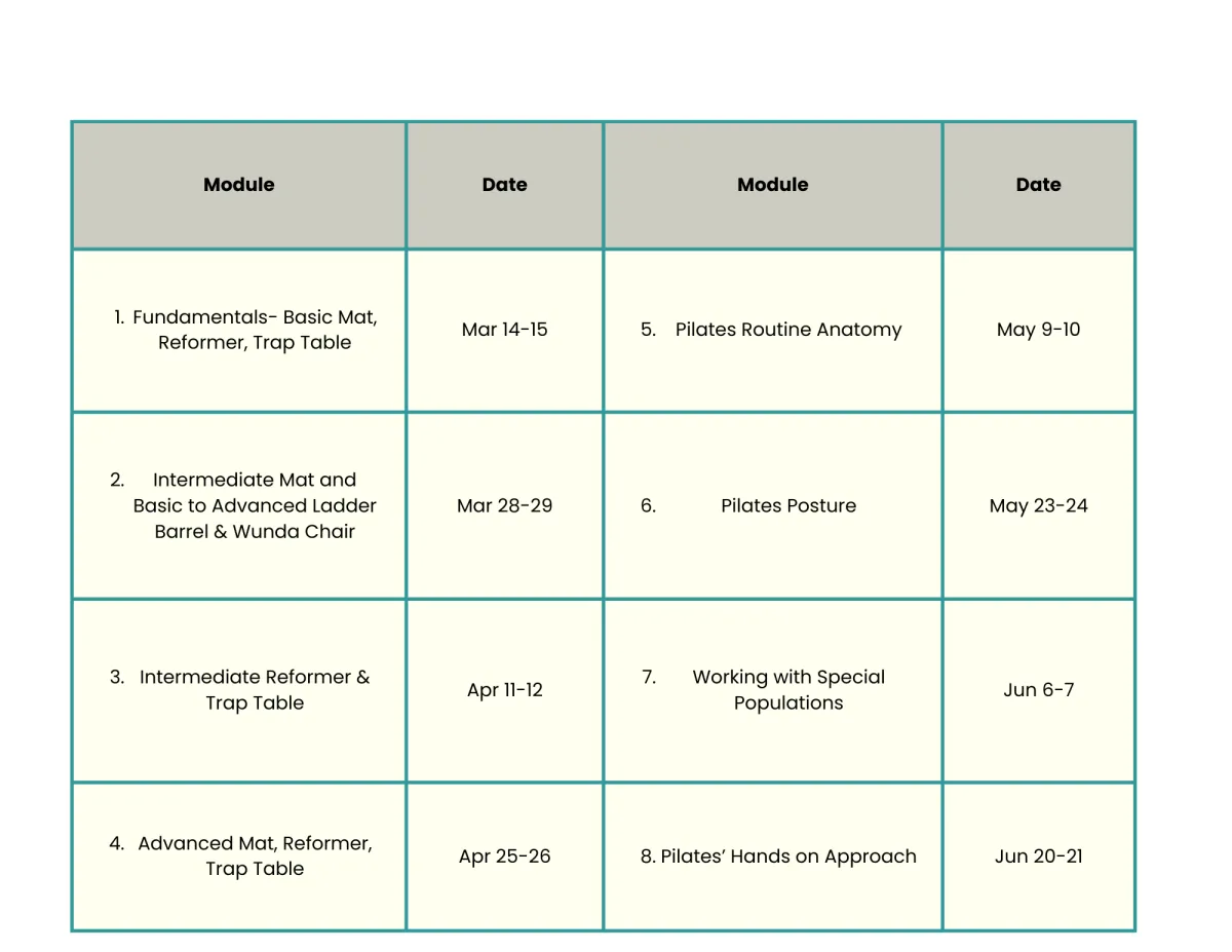 Our Comprehensive program consists of eight modules and 550 hours of curriculum, including internship. We are dedicated to making Pilates accessible to everybody.